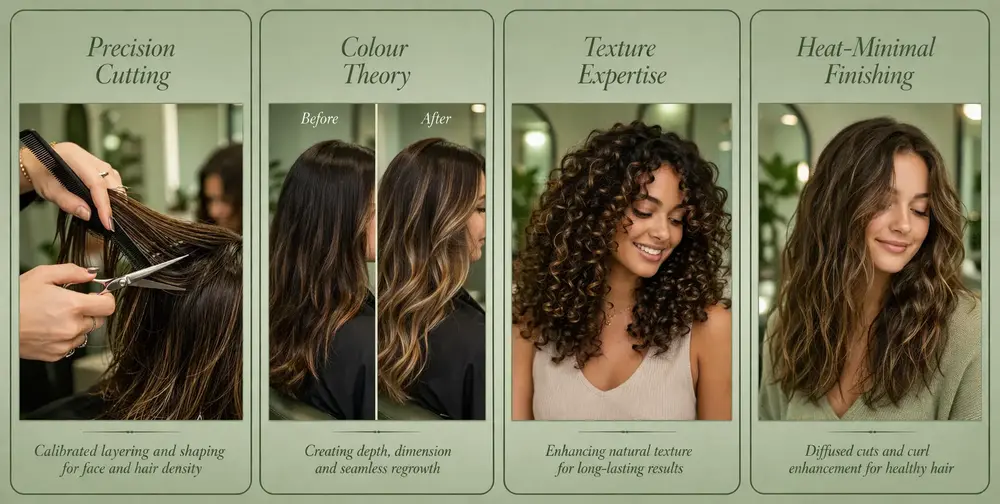 • Consultation – Every client is preceded by a proper diagnostic consultation, including face shape, hair porosity, hair texture, and lifestyle, before any suggestion is made